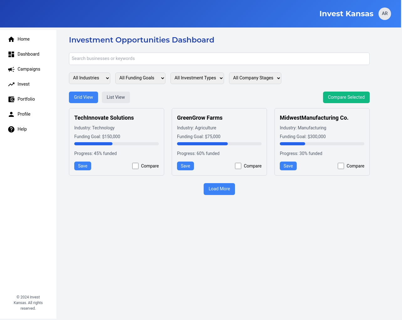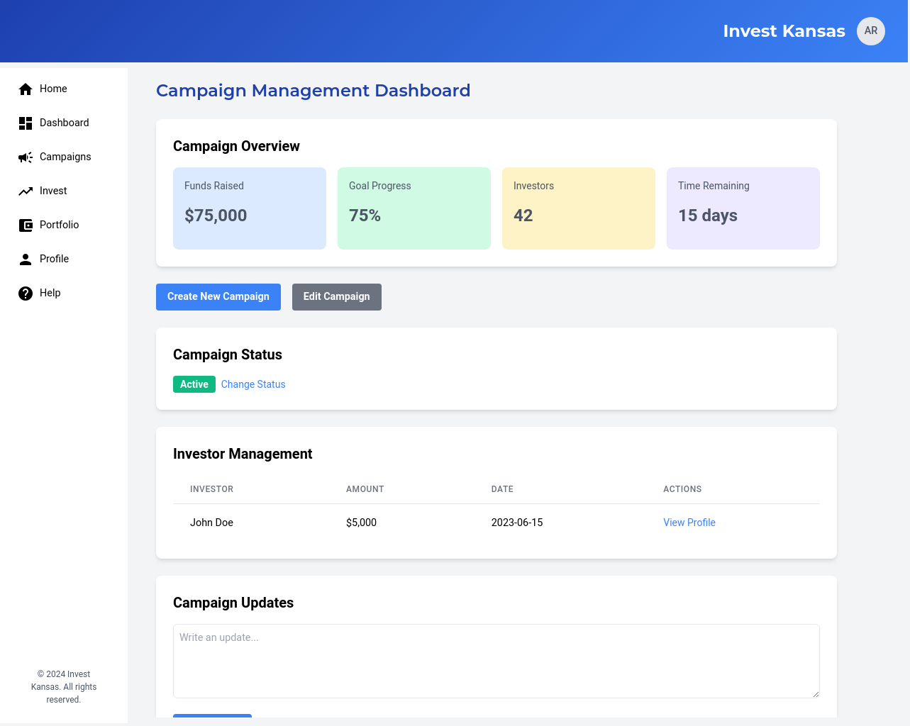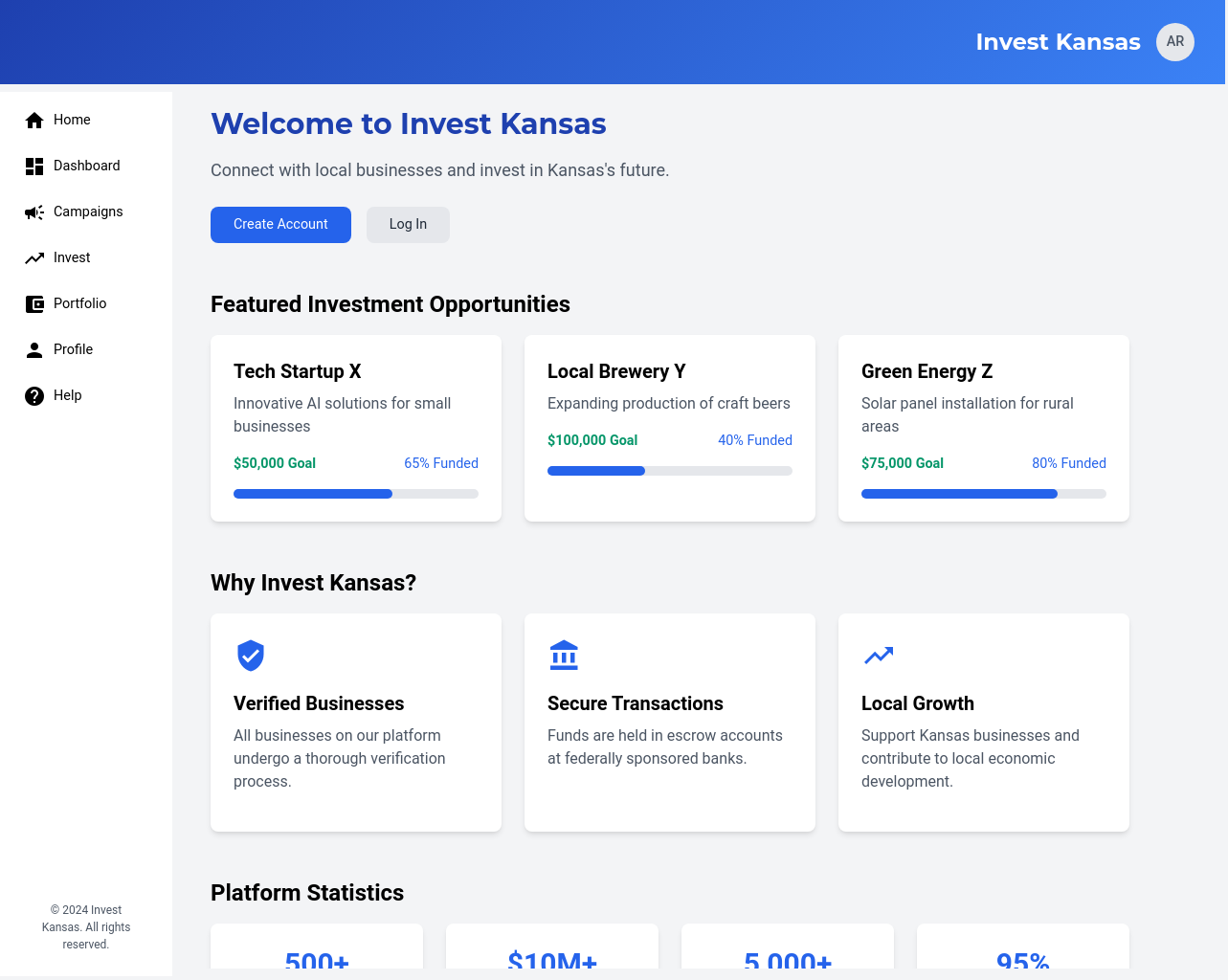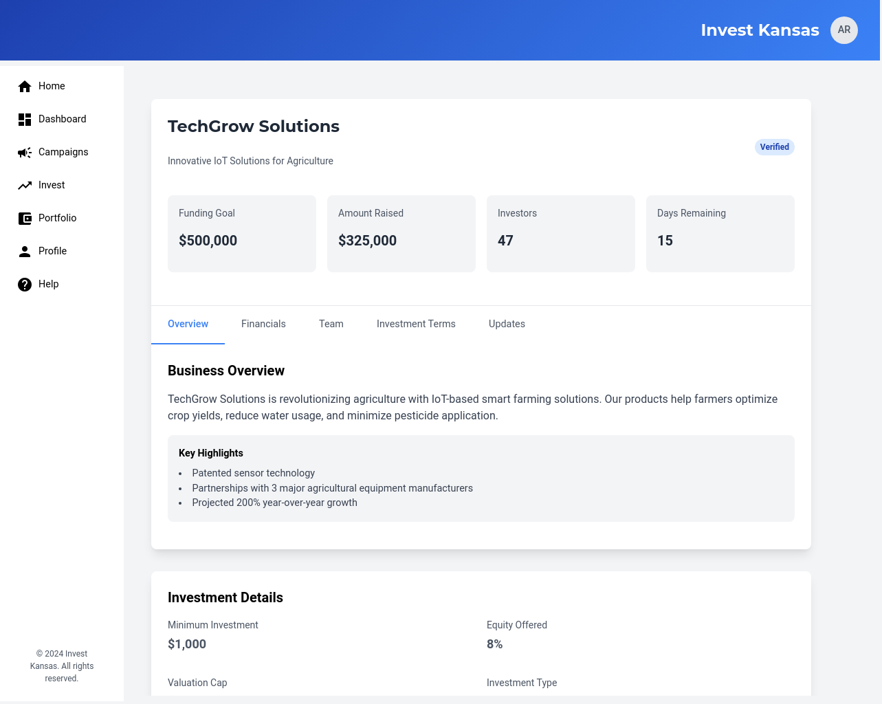 A centralized dashboard that allows investors to search, filter, and explore available Kansas-based businesses and their fundraising campaigns.