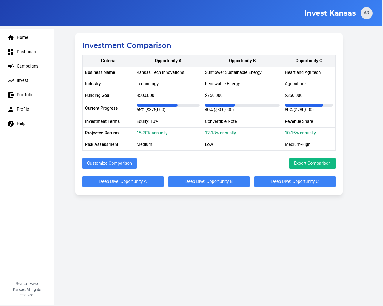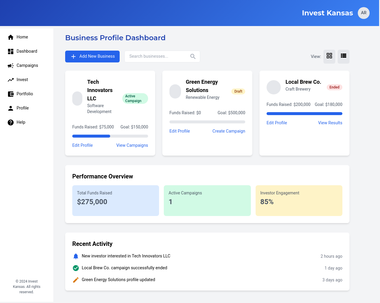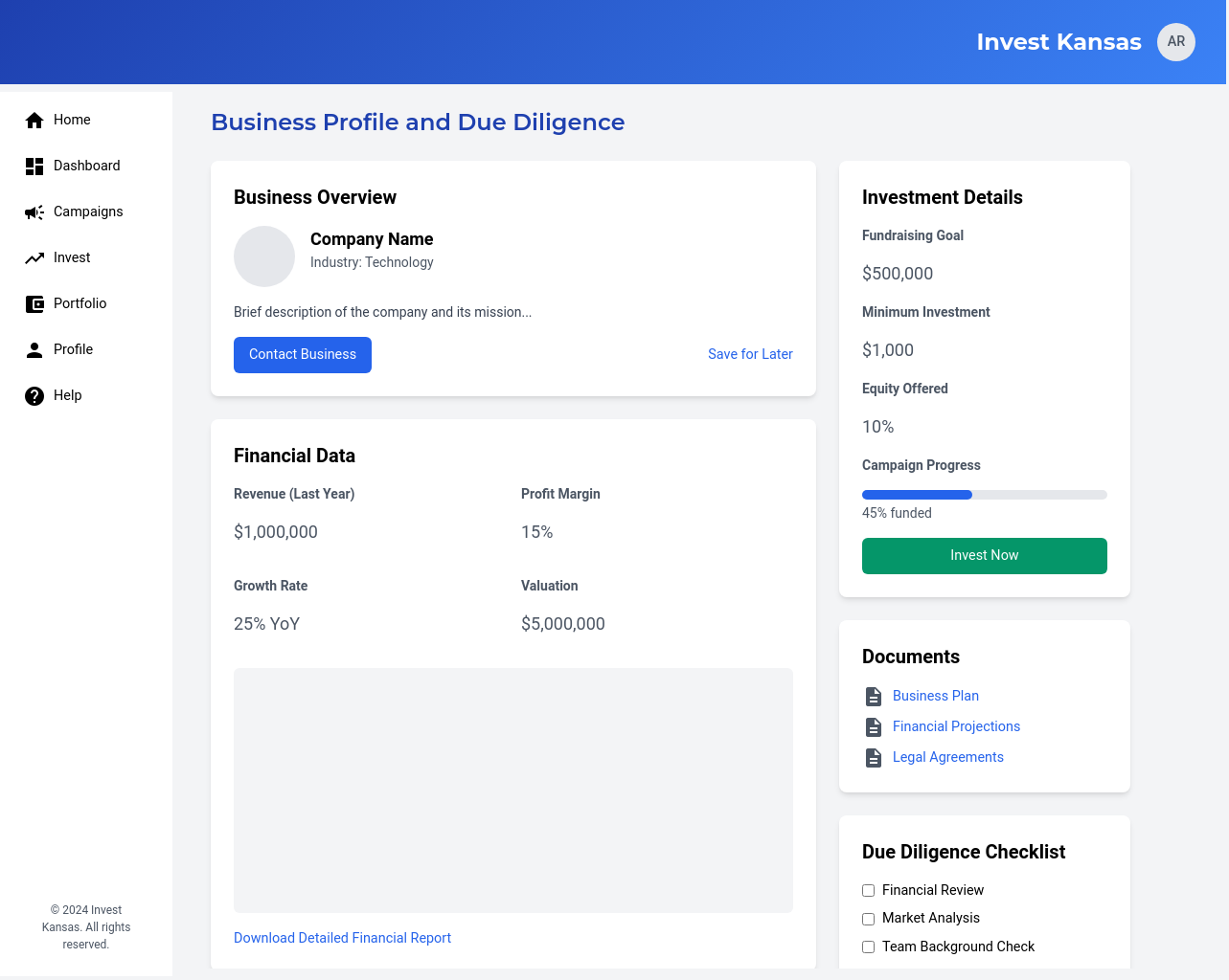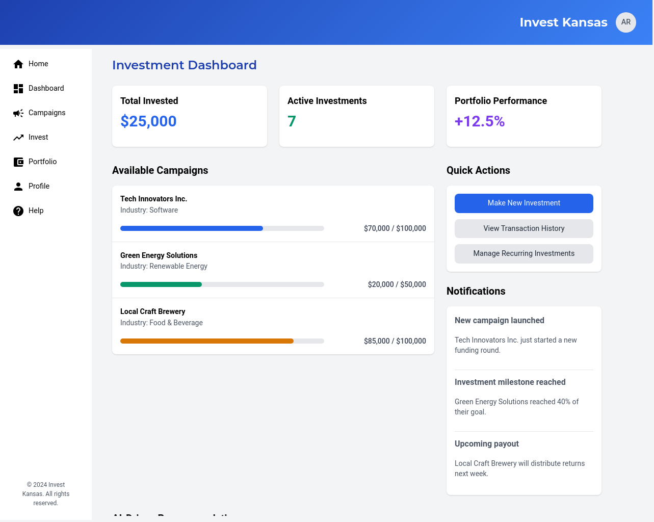 A centralized dashboard that allows investors to search, filter, and explore available Kansas-based businesses and their fundraising campaigns.