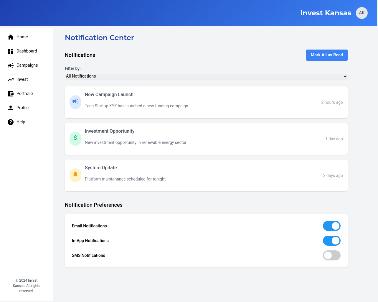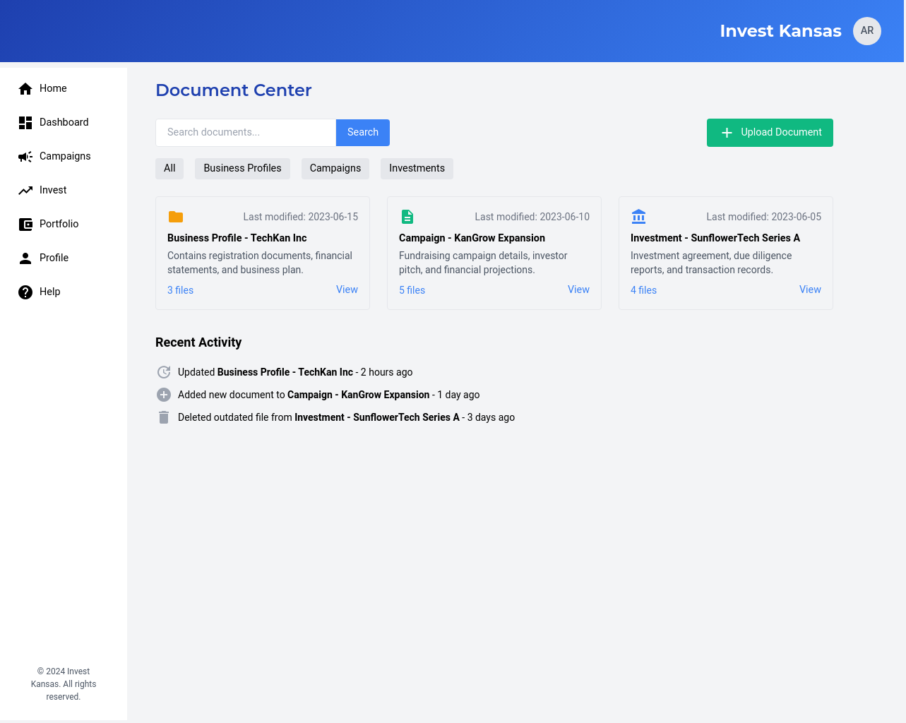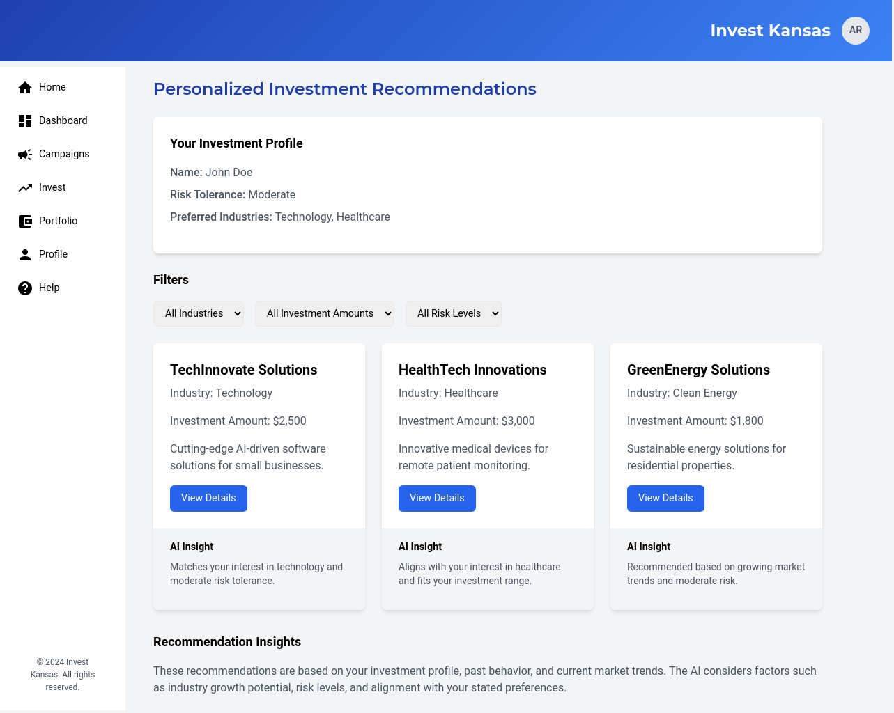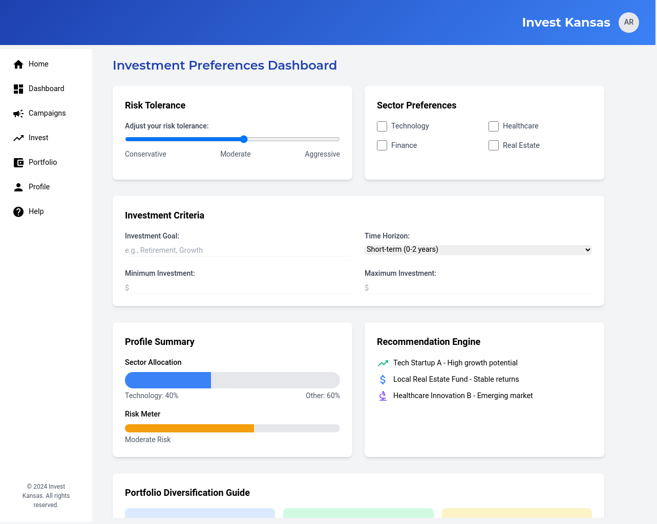 A centralized dashboard that allows investors to search, filter, and explore available Kansas-based businesses and their fundraising campaigns.