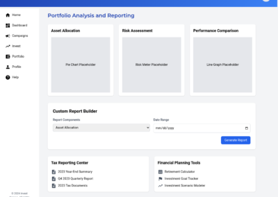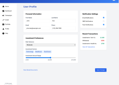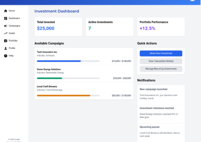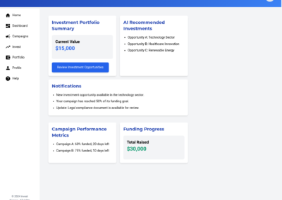 - Personalized AI Guidance: The AI-powered investment recommendations should be presented in a clear, actionable manner. Provide visually compelling insights into potential investments, highlighting key factors like risk, return, and alignment with user profiles. Integrate personalized recommendations throughout the platform to guide users towards relevant opportunities.