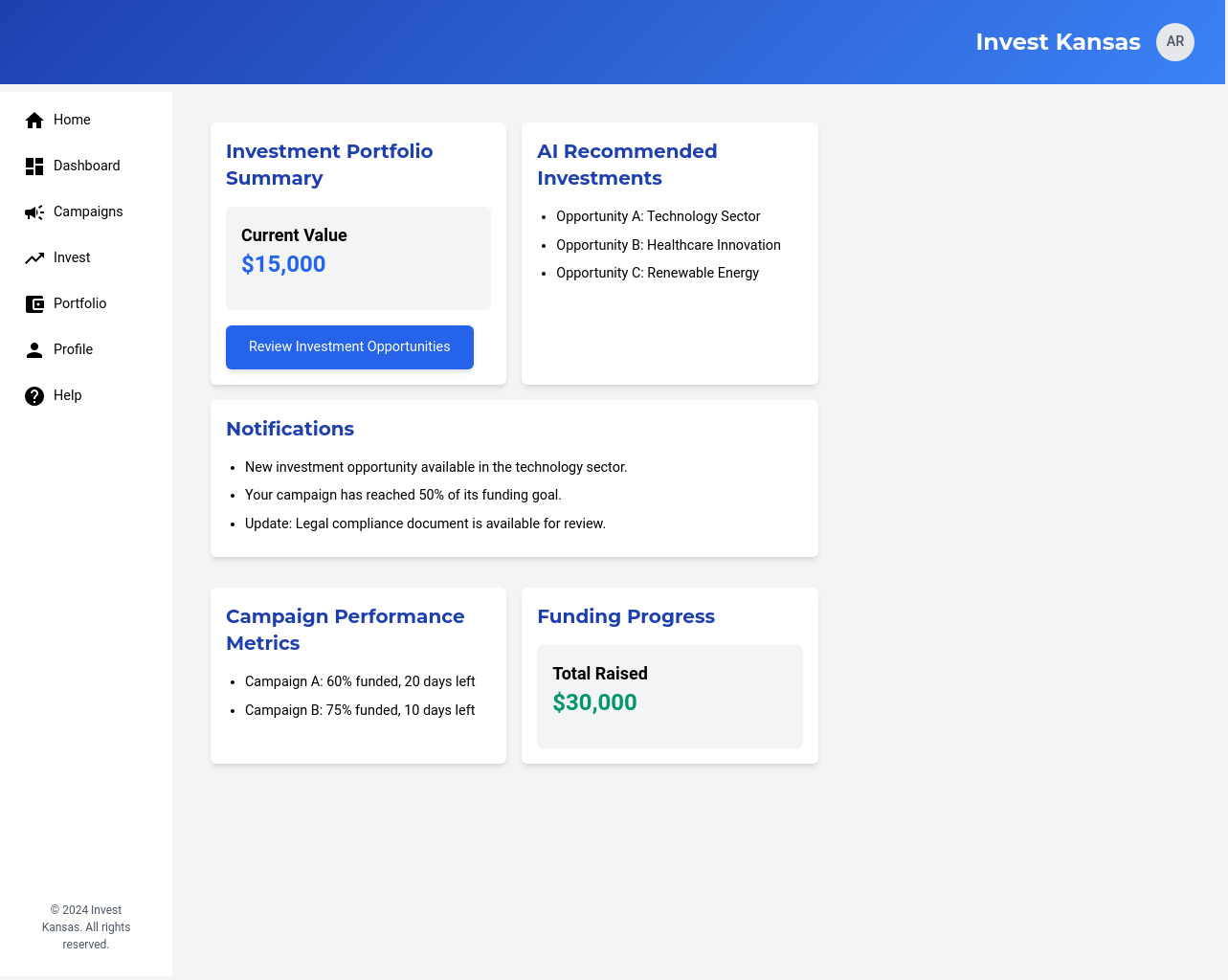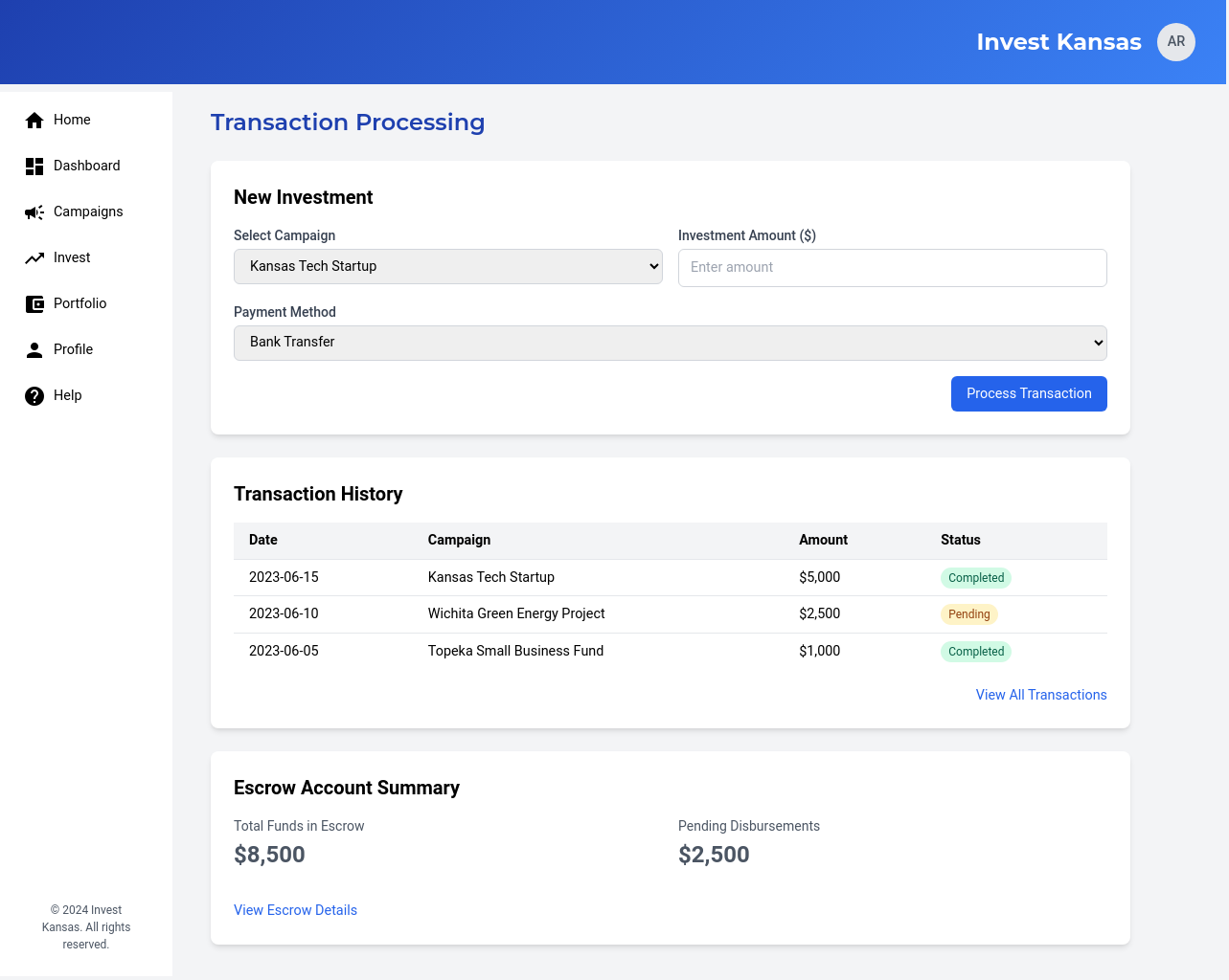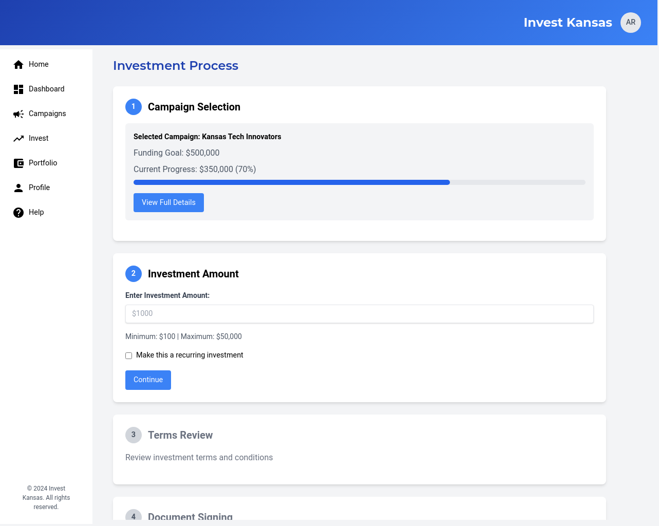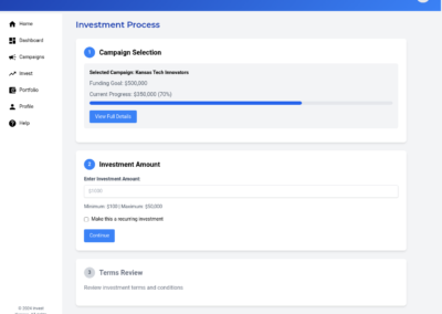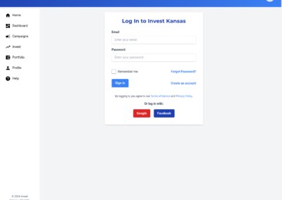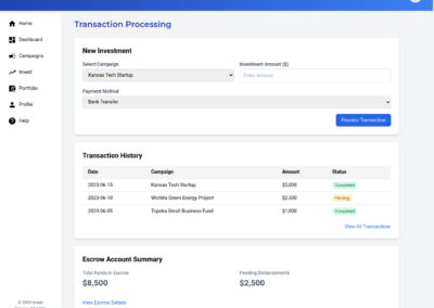 We will develop a comprehensive, user-friendly crowdfunding platform specifically designed for Kansas-based businesses and investors. The platform will feature user profiles for both businesses and investors, enabling them to connect and interact effectively. Businesses will be able to launch fundraising campaigns with customizable parameters, including investment amounts, asset types, and fundraising goals. Investors will be able to review business profiles and campaigns, making informed investment decisions. The platform will ensure secure transactions through a dedicated escrow account held at a federally sponsored banking institution, ensuring funds are disbursed only after all escrow criteria are met. The platform will incorporate e-signature capabilities, streamlining the investment process and ensuring legal compliance. We will also implement a robust verification process for all users and businesses, ensuring the platform’s credibility and reliability. This platform will address the challenges Kansas businesses face in accessing funding from traditional sources, providing a streamlined and secure pathway for micro-investors to invest in promising local ventures. The solution will also provide AI-based investment recommendations.