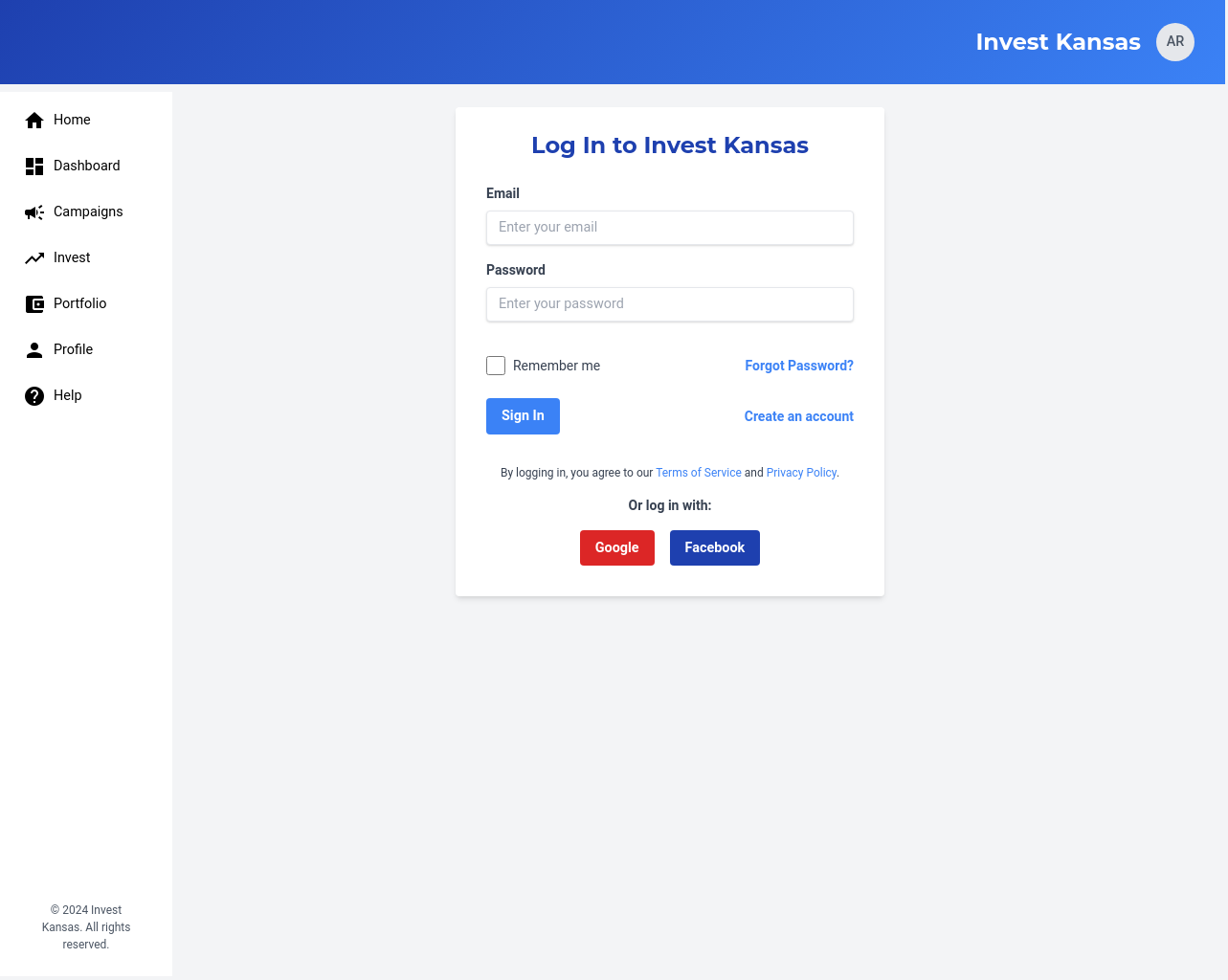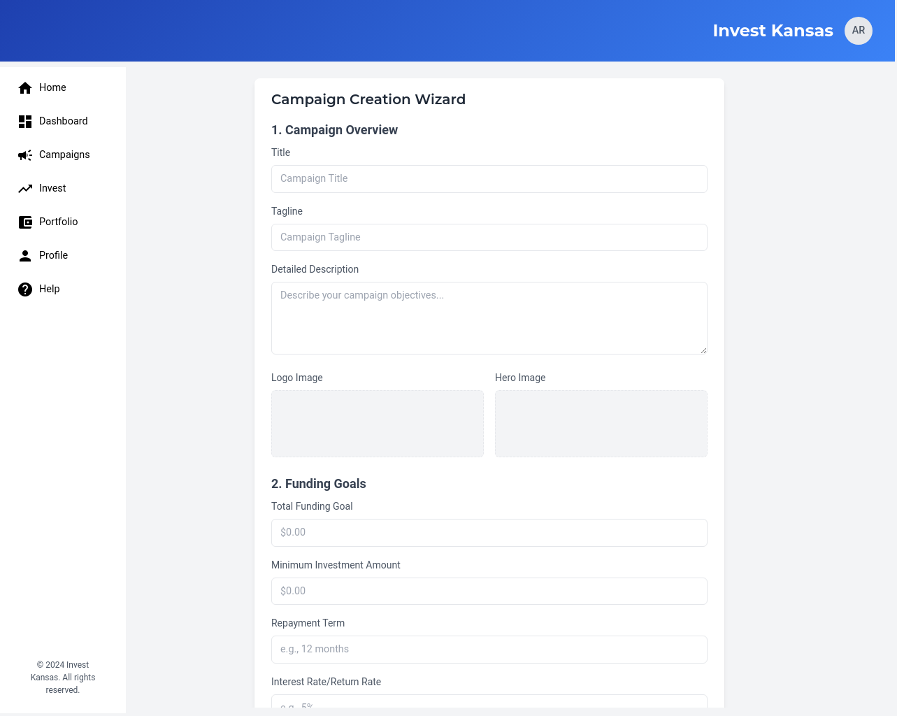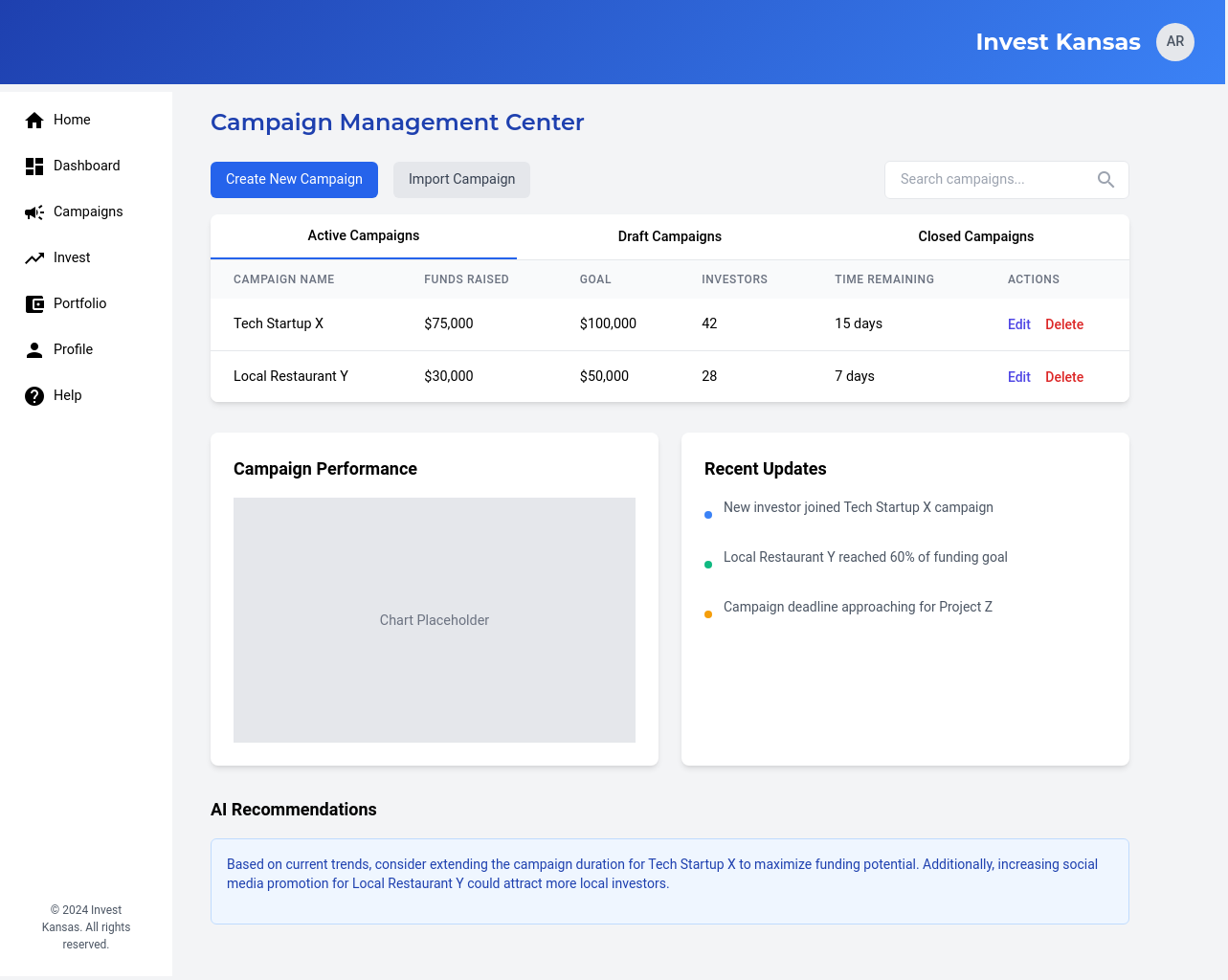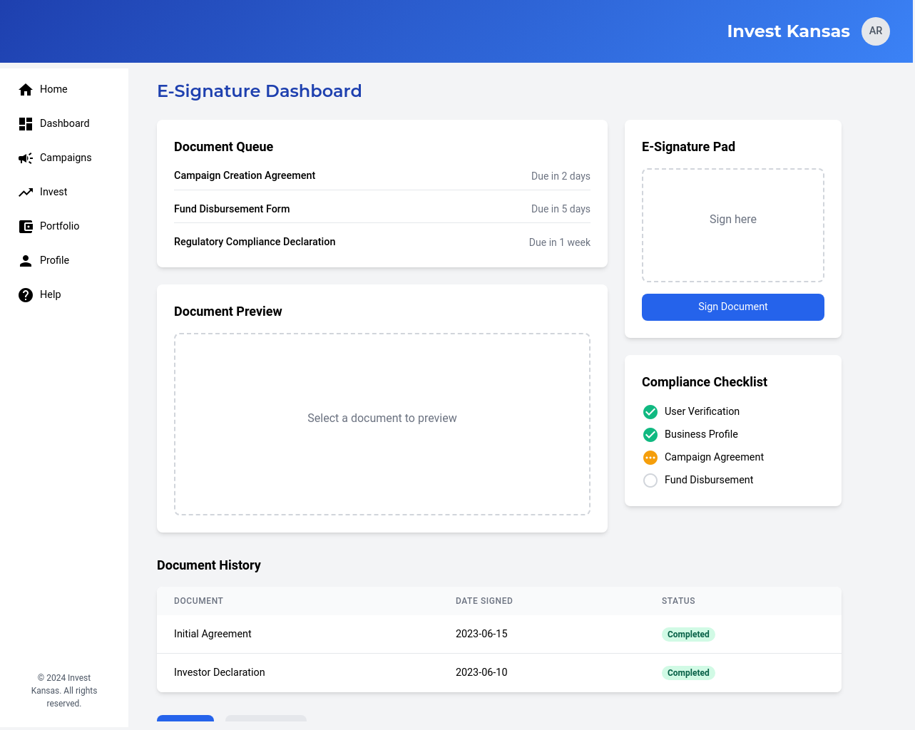We will develop a comprehensive, user-friendly crowdfunding platform specifically designed for Kansas-based businesses and investors. The platform will feature user profiles for both businesses and investors, enabling them to connect and interact effectively. Businesses will be able to launch fundraising campaigns with customizable parameters, including investment amounts, asset types, and fundraising goals. Investors will be able to review business profiles and campaigns, making informed investment decisions. The platform will ensure secure transactions through a dedicated escrow account held at a federally sponsored banking institution, ensuring funds are disbursed only after all escrow criteria are met. The platform will incorporate e-signature capabilities, streamlining the investment process and ensuring legal compliance. We will also implement a robust verification process for all users and businesses, ensuring the platform’s credibility and reliability. This platform will address the challenges Kansas businesses face in accessing funding from traditional sources, providing a streamlined and secure pathway for micro-investors to invest in promising local ventures. The solution will also provide AI-based investment recommendations.