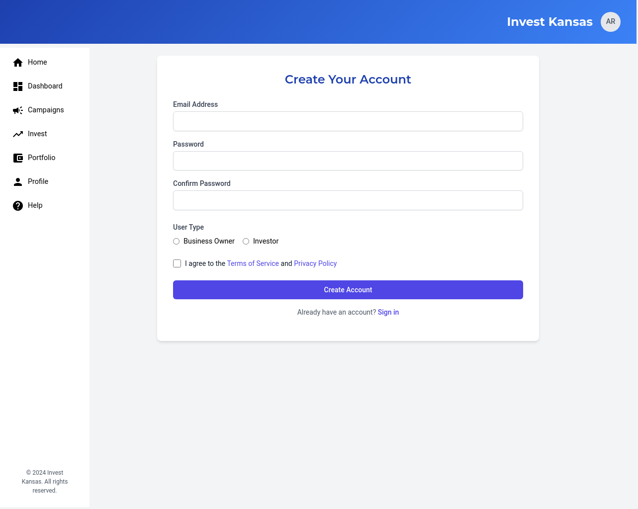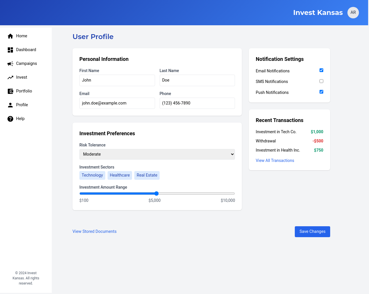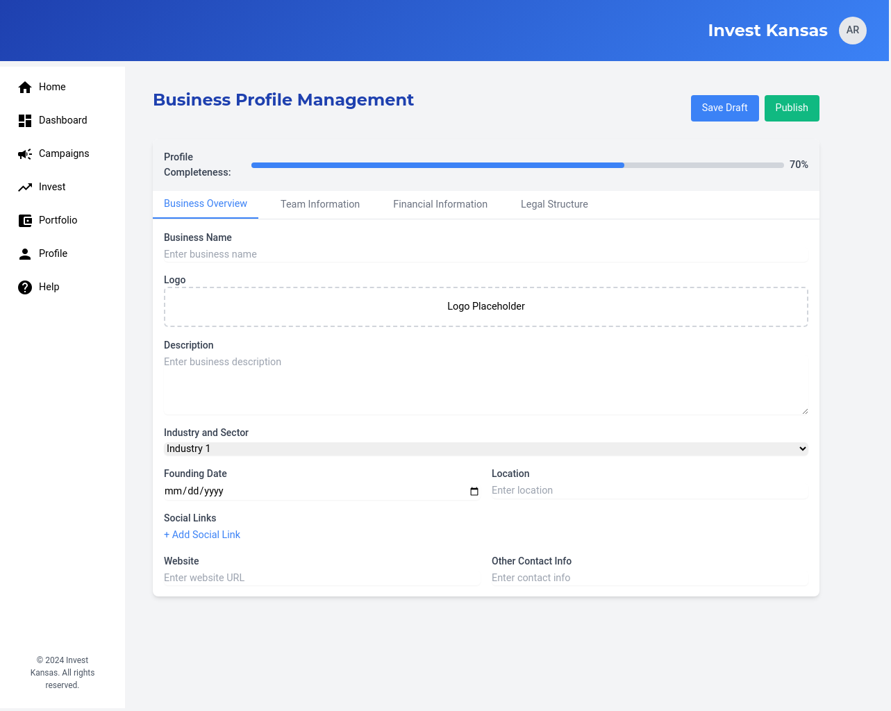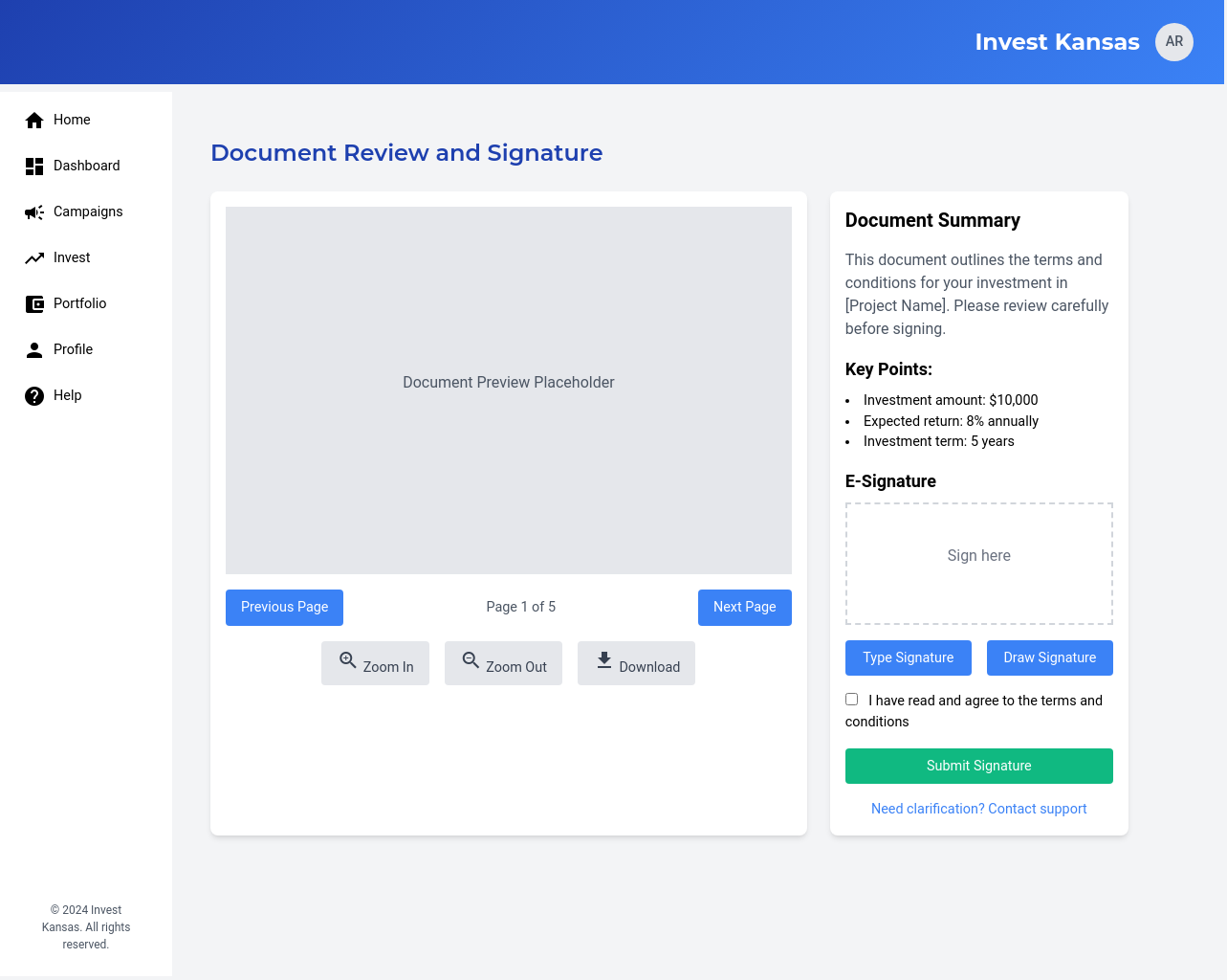 We will develop a comprehensive, user-friendly crowdfunding platform specifically designed for Kansas-based businesses and investors. The platform will feature user profiles for both businesses and investors, enabling them to connect and interact effectively. Businesses will be able to launch fundraising campaigns with customizable parameters, including investment amounts, asset types, and fundraising goals. Investors will be able to review business profiles and campaigns, making informed investment decisions. The platform will ensure secure transactions through a dedicated escrow account held at a federally sponsored banking institution, ensuring funds are disbursed only after all escrow criteria are met. The platform will incorporate e-signature capabilities, streamlining the investment process and ensuring legal compliance. We will also implement a robust verification process for all users and businesses, ensuring the platform’s credibility and reliability. This platform will address the challenges Kansas businesses face in accessing funding from traditional sources, providing a streamlined and secure pathway for micro-investors to invest in promising local ventures. The solution will also provide AI-based investment recommendations.