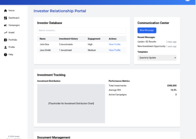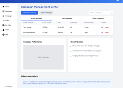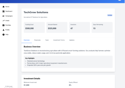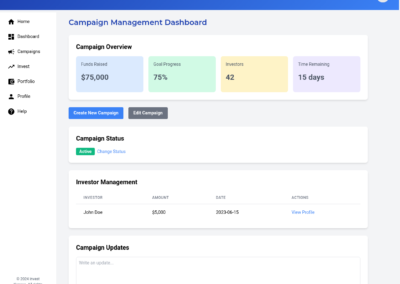 - Monitor Campaign Progress: Track the fundraising campaign’s performance, including funds raised, investor interest, and time remaining.