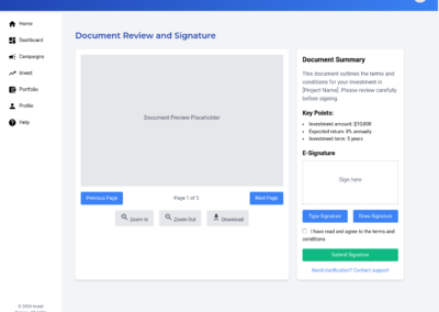 - Legal compliance: An integrated solution for managing legal requirements, including e-signatures and necessary documentation, to simplify the investment process and ensure regulatory adherence.