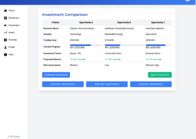 A modal window that allows investors to compare multiple investment opportunities side by side, facilitating easy decision-making.