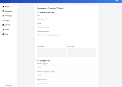 The Campaign Creation Wizard guides users through the process of setting up a new campaign. It includes steps for setting fundraising goals, describing the business, uploading necessary documents, and defining investment terms. This intuitive multi-step process ensures that users can efficiently and effectively create campaigns that align with their objectives, while providing clear guidance and support throughout the setup.